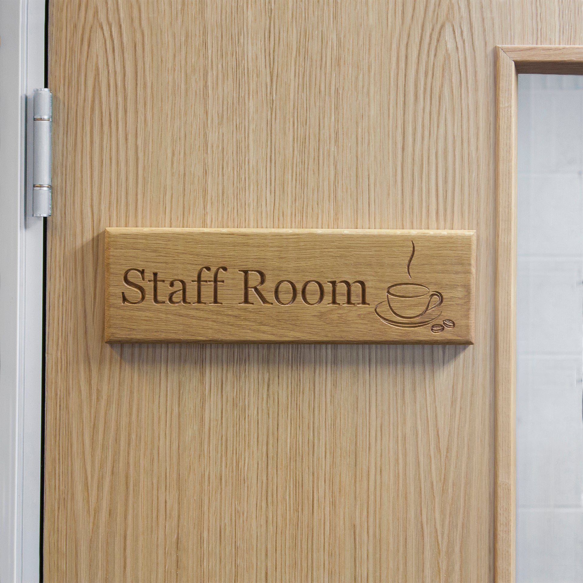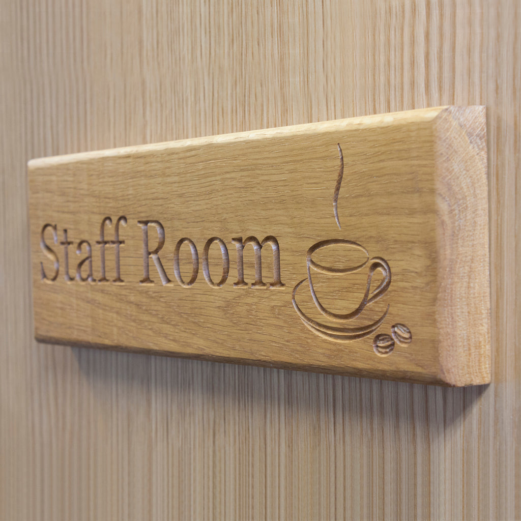 Ideal sign for the identification of the staff room. Made from chunky 2cm solid oak and deep engraved to make the sign stand out.