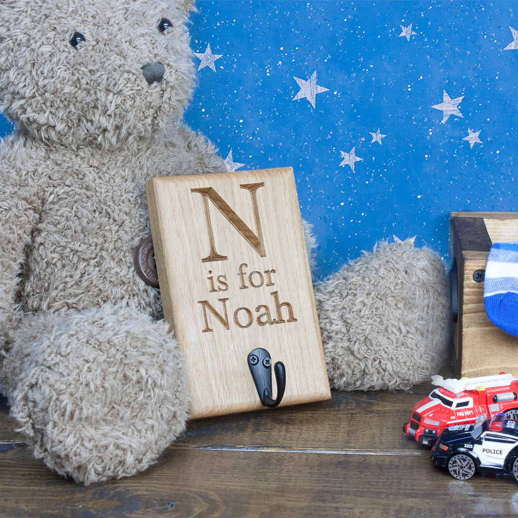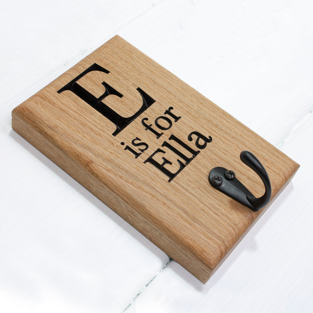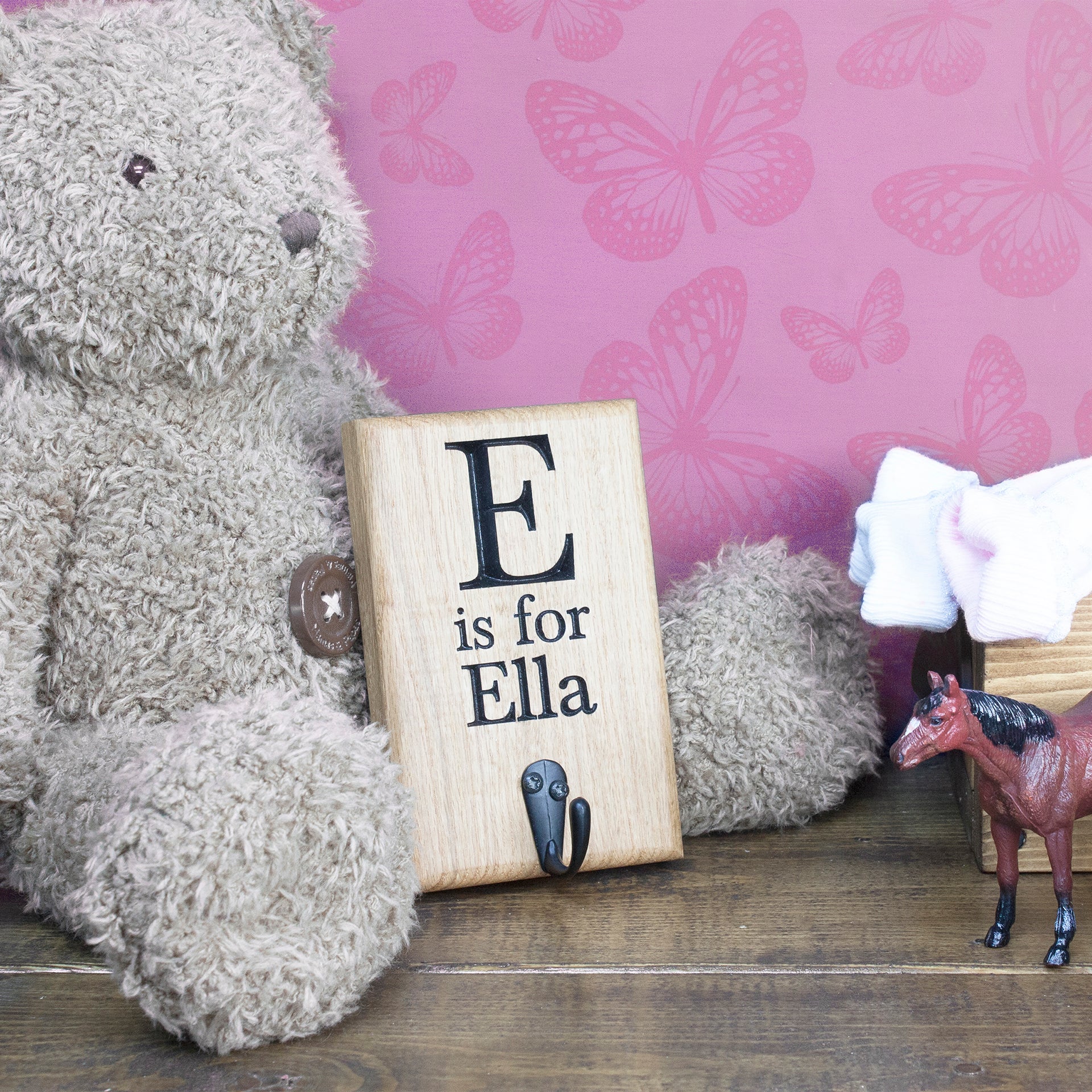 This charming oak coat hook is a lovely addition to any children’s room or hallway. Featuring first initial and full name, your child will know exactly where their coat needs to go.