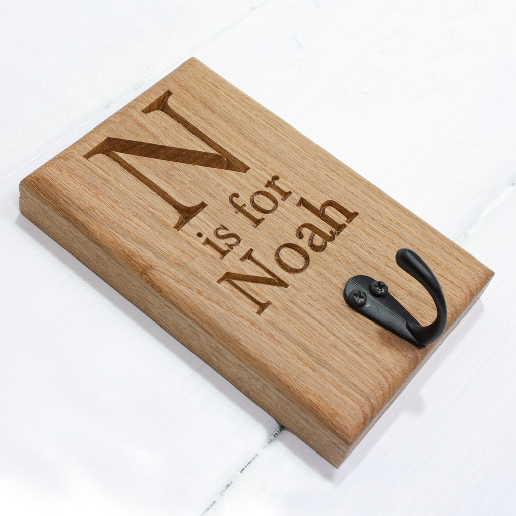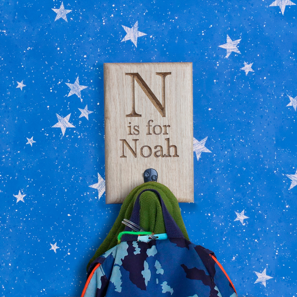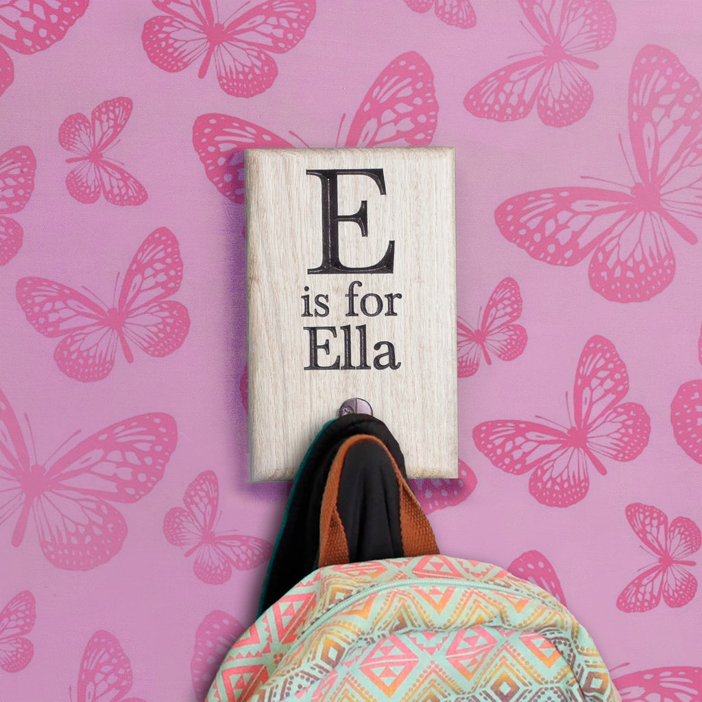 This charming oak coat hook is a lovely addition to any children’s room or hallway. Featuring first initial and full name, your child will know exactly where their coat needs to go.
