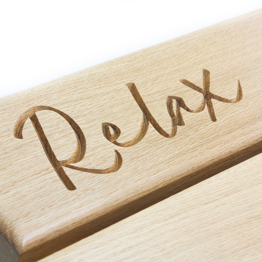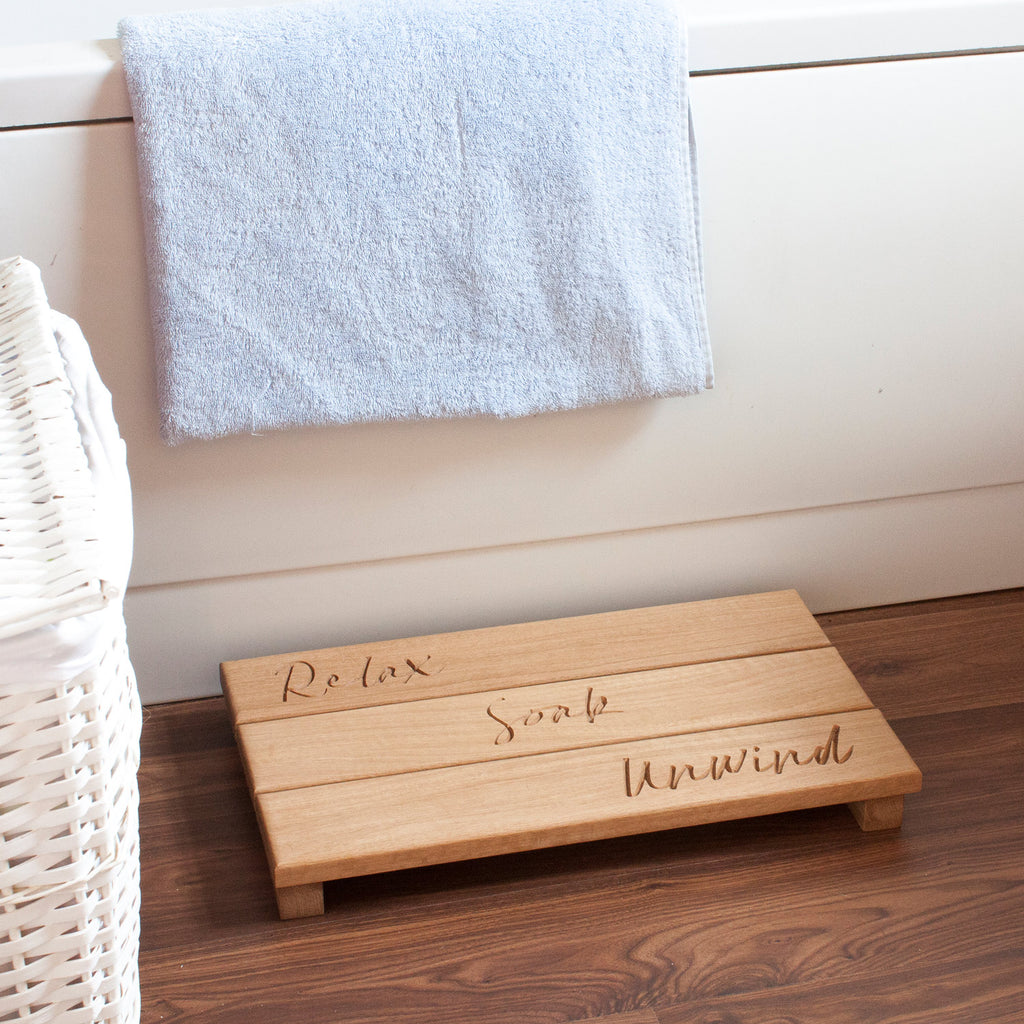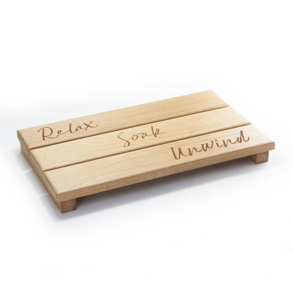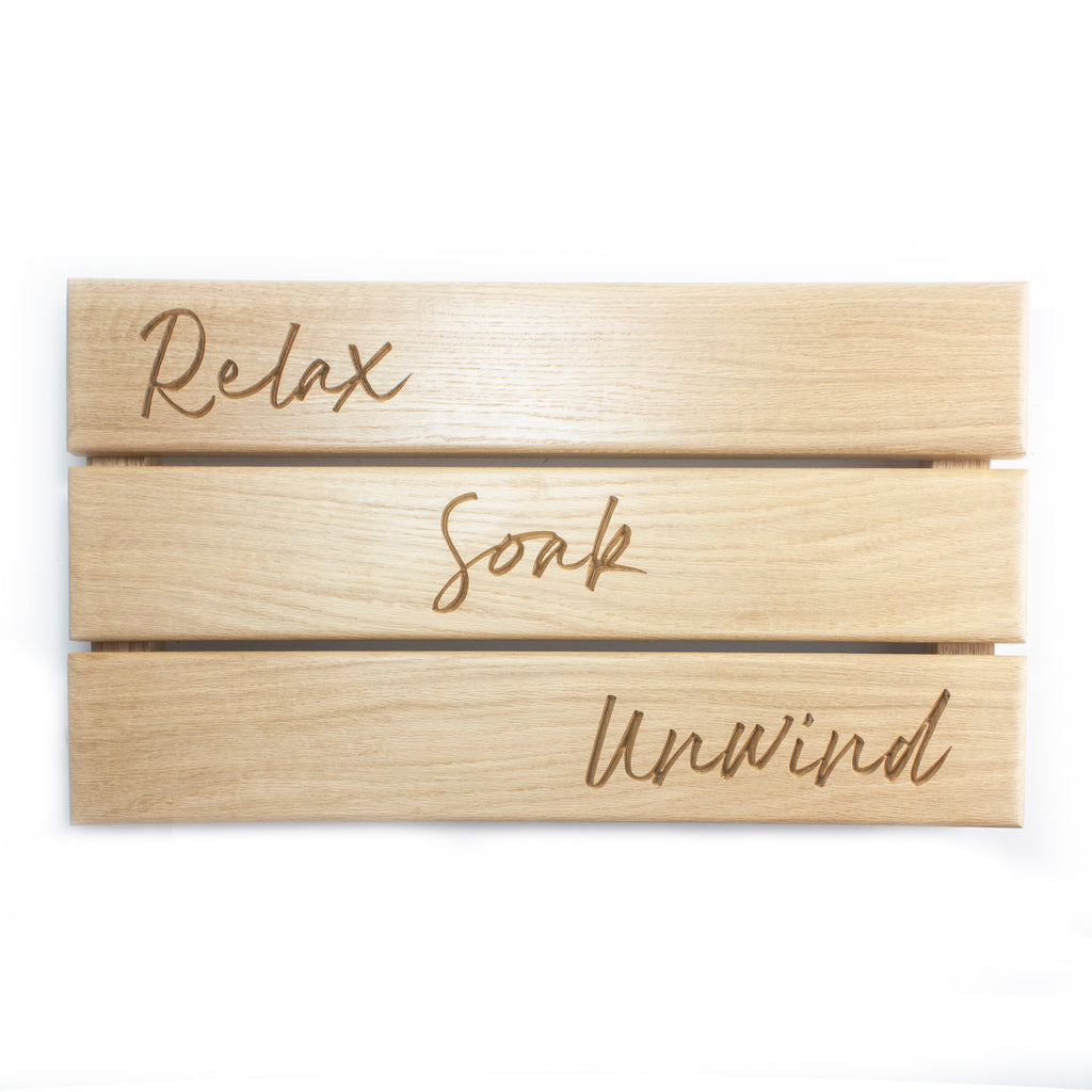 Add a touch of style to your bathroom with this charming Solid Oak Duck Board. Engraved with the words Relax, Soak & Unwind, this duck board provides an attractive and sturdy area to step onto from the bath or shower, avoiding slippery tiles and damp bath mats. Also features non-slip rubber feet making it perfect for use on tiled floors.
