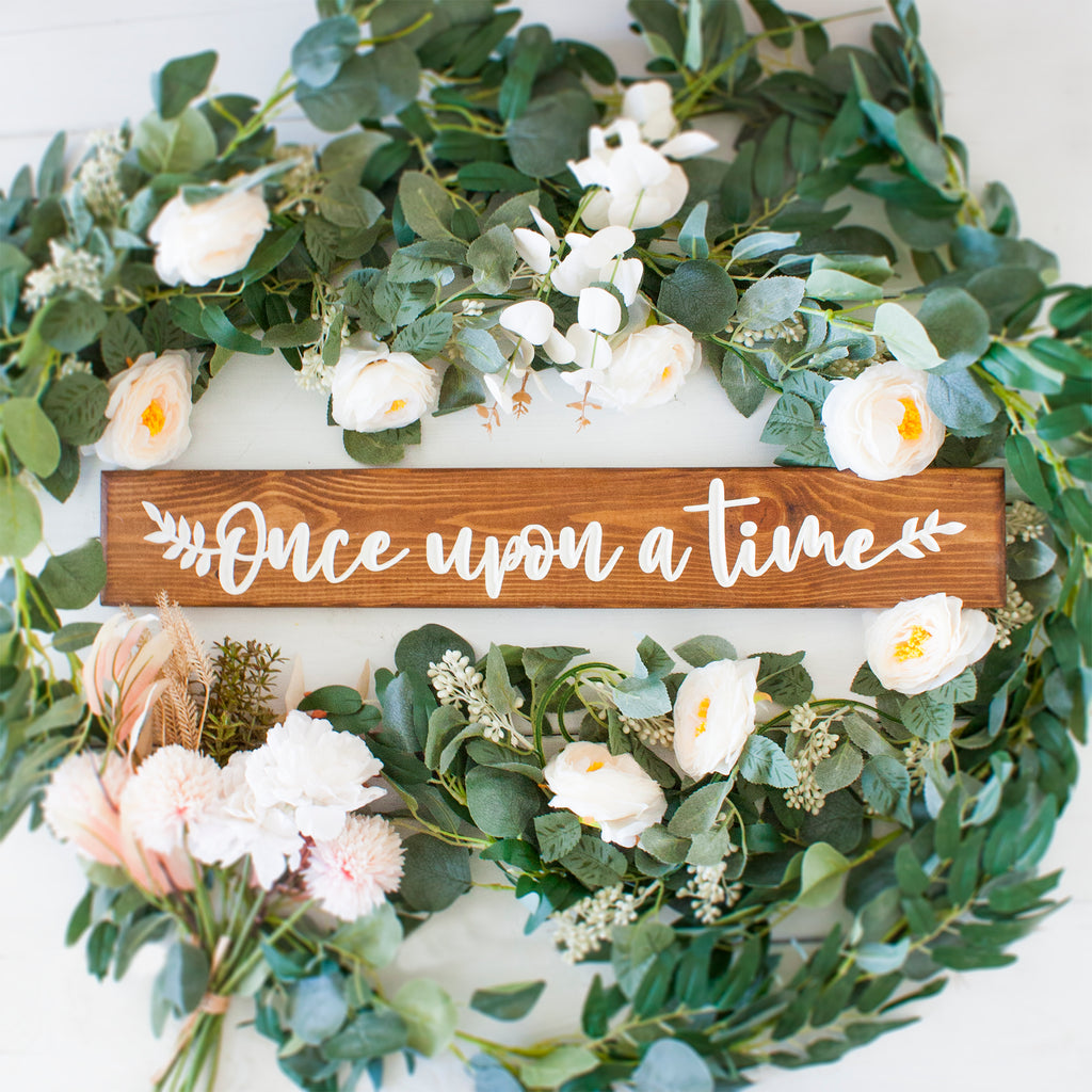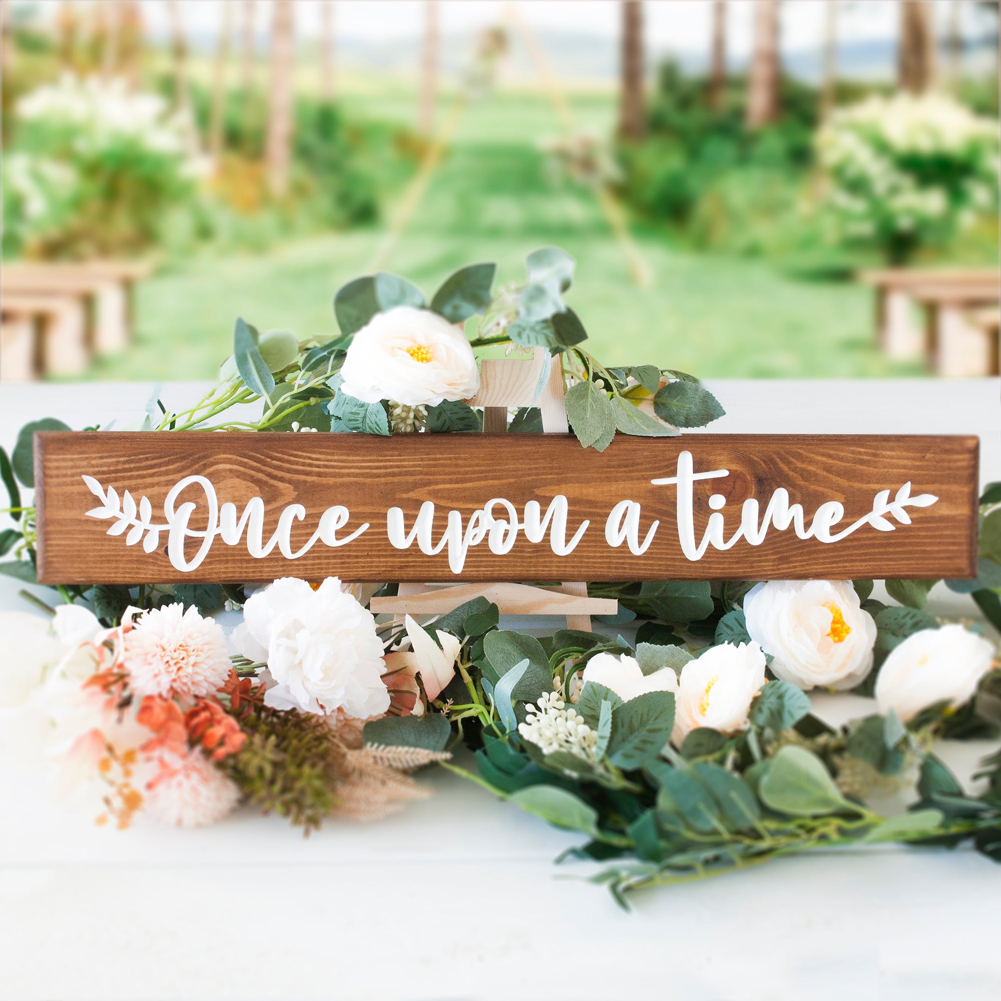 This beautifully hand crafted rustic 'Once Upon A Time' wedding sign can be used in a number of places throughout your rustic wedding. Place on the top table for a stunning foreground centerpiece for photos or place around the venue to attract & charm guests.Features a beautiful rustic floral design with 'Once Upon A Time', a classic sentiment bestowed to the beginning of all great stories.