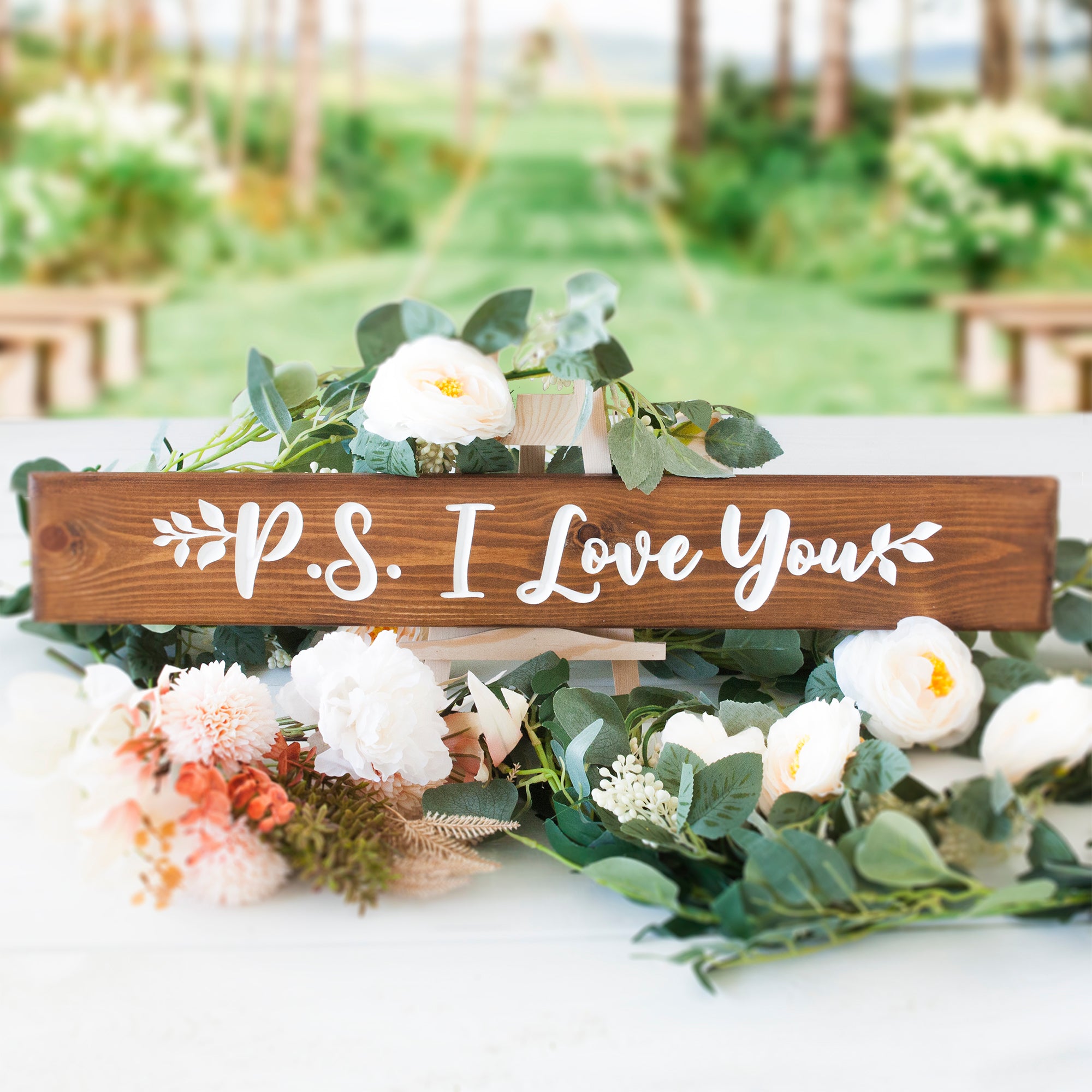 This beautifully hand crafted rustic P.S. I Love You wedding sign can be used in a number of places throughout your rustic wedding. Place on the top table for a stunning foreground centerpiece for photos or place around the venue to attract & charm guests.